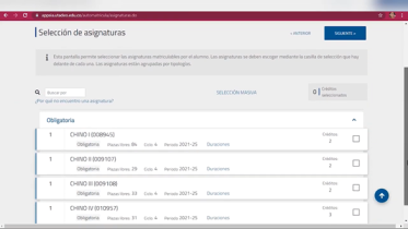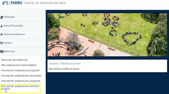 Ve al módulo de matricula en el menú de la izquierda y escoge Inscripción asignaturas estudios propios