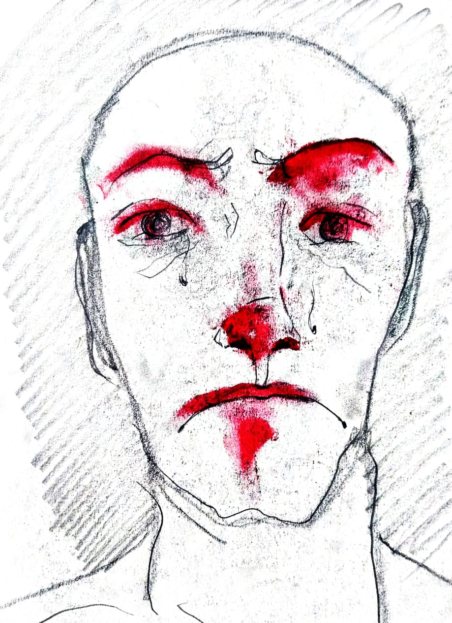 Todos hacen sus trabajos anteriormente ensayados, y sale ella, sale ella y la sala entera llora, preciosa payasa que hipnotiza, sus ojos son cual perlas amarillas, grandes y delineadas de negro; su mirada es como la de un gato; su nariz es naturalmente roja como una cereza, y su boca es rosa. Su cara tremendamente pálida y su cabello corto negro; ella cierra los ojos y empieza a cantar. Debajo de su falda hay dos palos de madera, sus muñones sangran y gota a gota dibujan un rostro en el escenario, sus manos no tienen uñas y su canto se vuelve un grito de angustia. Inesperadamente, como en cada acto, empieza a ascender, mientras Giorgio y yo vamos esforzándonos en las poleas para verla volar. Vuela y el público la aclama cerca, tiene un perfume a Jazmín y sus ojitos empapados de dolor me miran pidiendo ya bajarla del cielo.