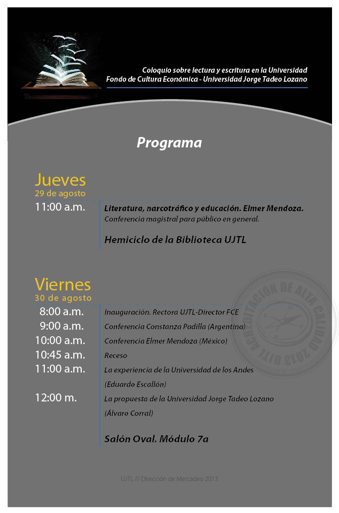 Los próximos jueves 29 y viernes 30 de agosto se invita a la comunidad tadeista a una jornada pedagógica sobre lectura y escritura con los escritores Elmer Mendoza de México y Constanza Padilla de Argentina.