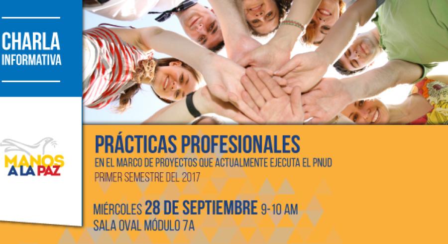 Este miércoles 28 de septiembre de 9 a 10 a. m.  en la Sala Oval  M- 7A se realizará una charla informativa sobre el Programa Manos a la Paz, en el que se permite que estudiantes de pregrado realicen sus pasantías profesionales en el marco de proyectos que actualmente ejecuta el PNUD.