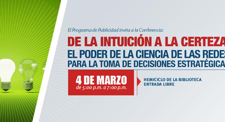 “De la intuición a la certeza: el poder de la ciencia de las redes para la toma de decisiones estratégicas”, es el nombre de la conferencia que está organizando el programa de Publicidad y que se llevará a cabo el martes 4 de marzo, desde las 5:00 de la tarde en el Hemiciclo de la Biblioteca.