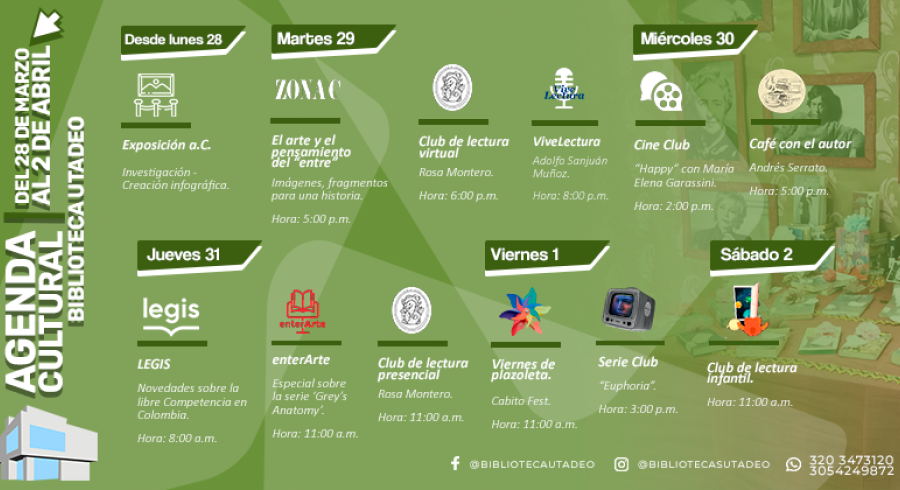 Agenda cultural de tu Biblioteca UTadeo de la semana del 28 de marzo al 2 de abril.