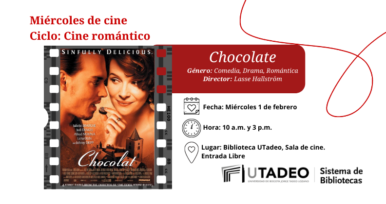 Miércoles de cine Ciclo: Cine Romántico Película: Chocolate Sala de cine, cuarto piso Hora: 10 a.m. y 3 p.m. Talking parrots club Club de inglés Sala de exposiciones, tercer piso Todos los miércoles Hora: 1 p.m. a 2 p.m |