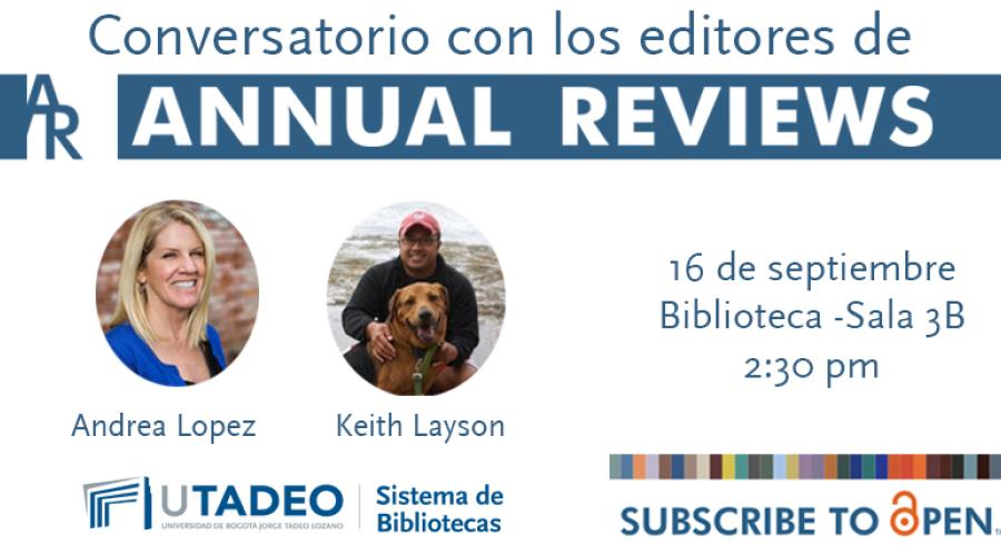 El Sistema de Bibliotecas y la Dirección de Investigación de la Universidad Jorge Tadeo Lozano hace una cordial invitación al conversatorio con los editores de Annual Reviews, quienes hablarán de su nuevo programa Subscribe to open, que ofrece a las instituciones y editoriales un camino rápido, justo y sostenible para las revistas con pago a acceso abierto.