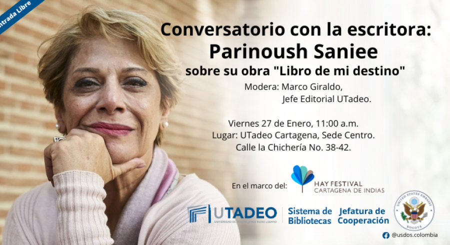 Con motivo del Hay Festival que se desarrolla en la ciudad de Cartagena de Indias, la Embajada de Estados Unidos en Colombia, la Universidad de Bogotá Jorge Tadeo Lozano Seccional Caribe, el Sistema de Bibliotecas y la Jefatura de Cooperación de la misma universidad, le invitan al Conversatorio con la escritora Parinoush Saniee sobre su obra "El libro de mi destino".
