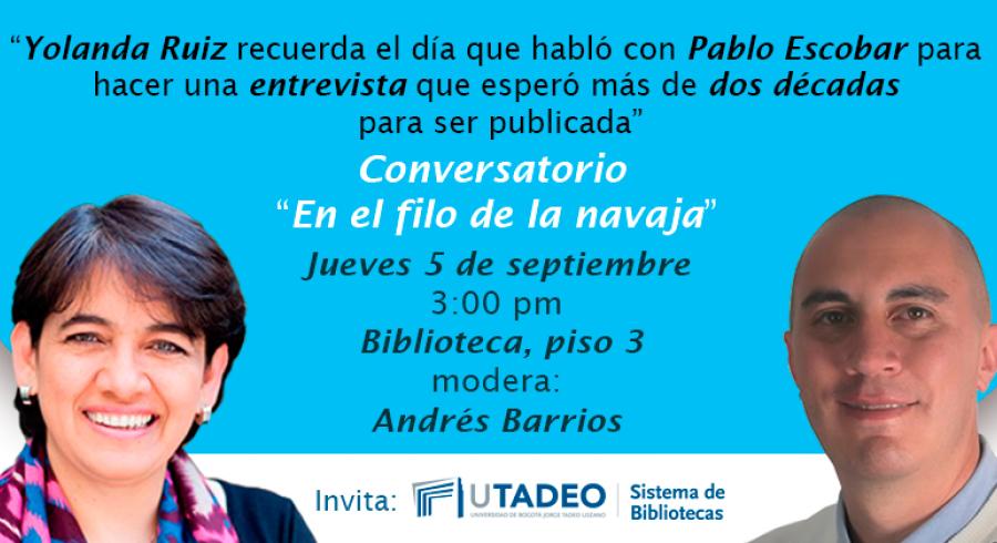 El Sistema de Bibliotecas de la Universidad de Bogotá Jorge Tadeo Lozano hace una cordial invitación a participar del conversatorio "En el filo de la navaja", un evento en el que la periodista Yolanda Ruiz socializará los detalles de la construcción de su libro. El evento se convierte en una gran oportunidad para conocer de primera mano, una parte de la carrera profesional de la periodista y el rigor con el que ha desarrollado su profesión. El evento tendrá lugar el Jueves 5 de septiembre a las 3:00 pm Biblioteca, piso 3, modera el profesor e investigador Andrés Barrios perteneciente a la Facultad de Ciencias Sociales de la Universidad.