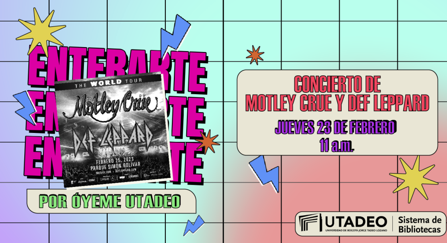 Destacadas EnterArte Compartir en Jueves, Febrero 23, 2023Programación radial por Óyeme UTadeo¡Hoy Concierto de Mötley Crüe y Def Leppard!Programa radialPor: Arturo VanegasÓyeme UTadeoTodos los juevesHora: 11 a.m.