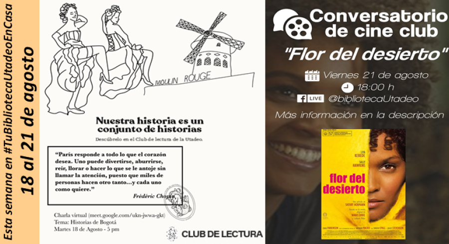 Destacadas Esta semana en #TuBibliotecaUtadeoEnCasa Compartir en Martes, Agosto 18, 2020Imágenes tomadas de FreepikEsta semana en #TuBibliotecaUtadeoEnCasa del 18 al 21 de agostoMartes 18 de agosto 5:00 pm: Club de lectura Viernes 21 de agosto6:00 pm: Conversatorio de Cine Club "Flor del desierto"