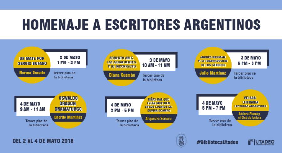 El programa de Estudios Literarios y Edición, el Club de Lectura y la Biblioteca tienen el gusto de invitar al homenaje a escritores argentinos, el cual se llevará a cabo del 2 al 4 de mayo de 2018.