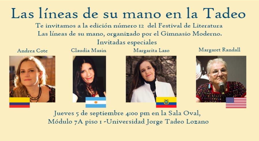 En el marco de la edición Número 12 del Festival de Literatura Las líneas de su mano, organizado por el Gimnasio Moderno, la Tadeo recibirá este jueves 5 de septiembre a las 4:00 de la tarde a las poetas Margaret Randall de Estados Unidos, Claudia Masin de Argentina, Margarita Laso de Ecuador y Andrea Cote de Colombia.