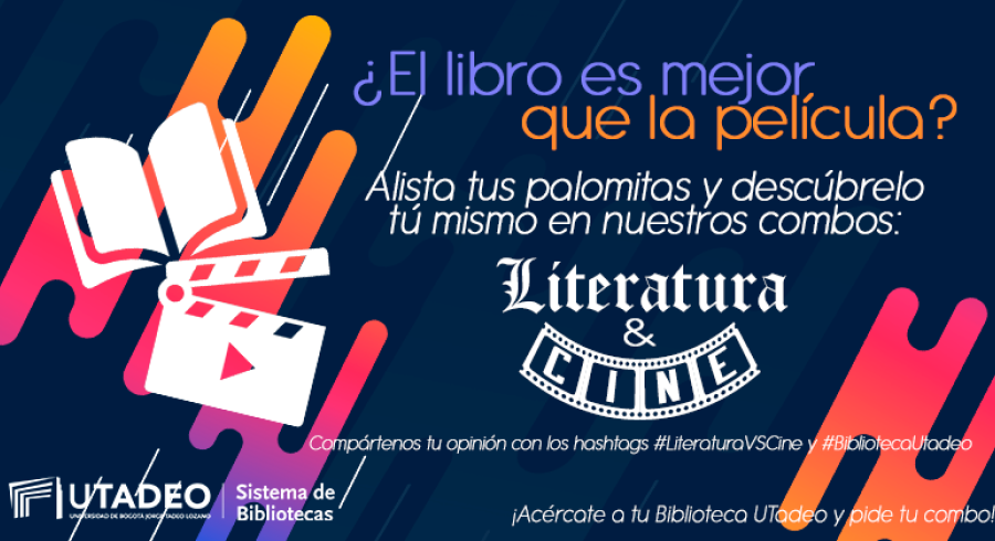 ¡Bienvenido a tu biblioteca UTadeo! Estamos felices de tenerte de regreso y por esto durante el mes de abril acércate a tu biblioteca y encontrarás combos variados de Libro y Película, escoge tu favorito, solicita el préstamo ¡y disfruta! Después compártenos tu opinión por redes sociales con los hashtags #LiteraturaVSCine y #BibliotecaUtadeo. Recuerda que contamos con todas las medidas de bioseguridad porque tu Biblioteca UTadeo te cuida.