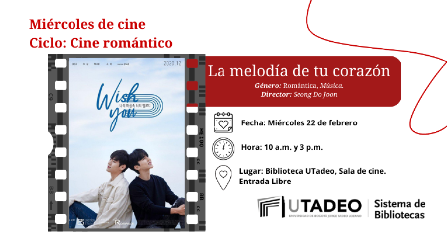 Destacadas Miércoles de cine: La melodía de tu corazón Compartir en Miércoles, Febrero 22, 2023Película: La melodía de tu corazón♥ Te invitamos a disfrutar la película “La melodía de tu corazón" Fecha: Miércoles, 22 de febreroCiclo: Cine románticoHora: 10 a.m. y 3:00 p.m.Lugar: Sala de cine, cuarto pisoEntrada libreTrailer: