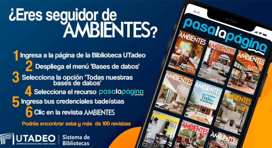 1. Ingresa a la página de la Biblioteca UTadeo. 2. Despliega el menú 'Bases de datos'. 3. Selecciona la opción 'Todas nuestras bases de datos'. 4. Selecciona el recurso 'PasaLaPágina'. 5. Ingresa tus credenciales tadeístas. 6. Clic en la revista 'Ambientes'.