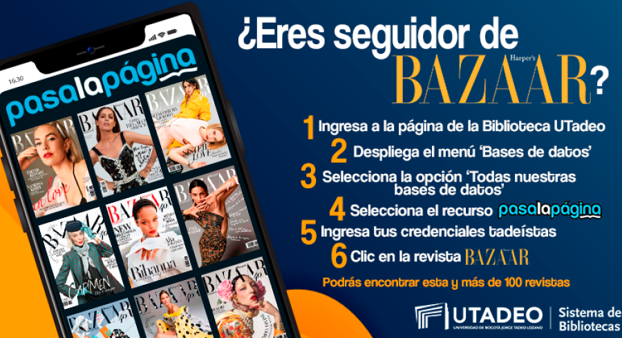 1. Ingresa a la página de la Biblioteca UTadeo. 2. Despliega el menú 'Bases de datos'. 3. Selecciona la opción 'Todas nuestras bases de datos'. 4. Selecciona el recurso 'PasaLaPágina'. 5. Ingresa tus credenciales tadeístas. 6. Clic en la revista 'Harper's Bazaar'.