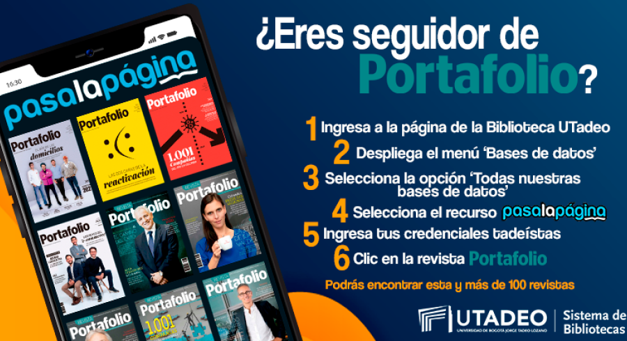 1. Ingresa a la página de la Biblioteca UTadeo. 2. Despliega el menú 'Bases de datos'. 3. Selecciona la opción 'Todas nuestras bases de datos'. 4. Selecciona el recurso 'PasaLaPágina'. 5. Ingresa tus credenciales tadeístas. 6. Clic en la revista 'Portafolio'.