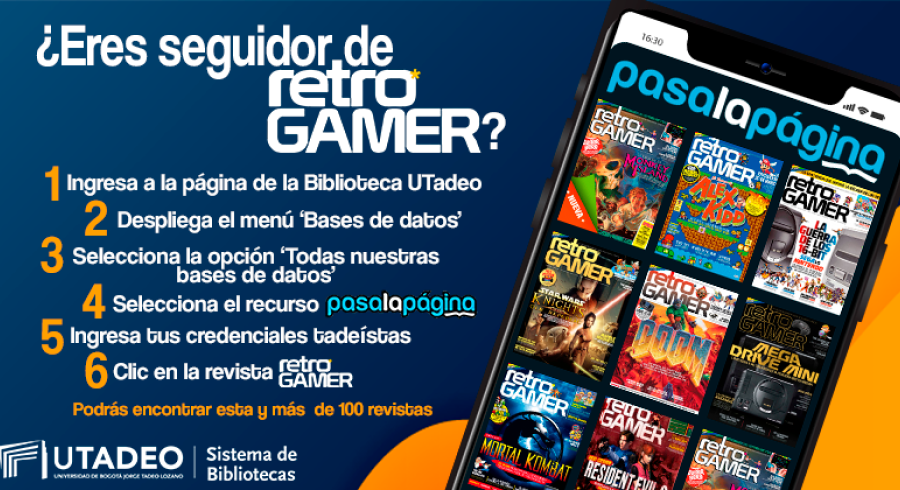 1. Ingresa a la página de la Biblioteca UTadeo. 2. Despliega el menú 'Bases de datos'. 3. Selecciona la opción 'Todas nuestras bases de datos'. 4. Selecciona el recurso 'PasaLaPágina'. 5. Ingresa tus credenciales tadeístas. 6. Clic en la revista 'Retro Gamer'.