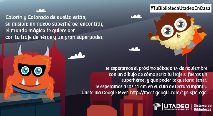 Colorin y Colorado de vuelta están, su misión: un nuevo superhéroe encontrar, el mundo mágico te quiere ver con tu traje de héroe y un gran superpoder. Colorín y Colorado están ansiosos por verte, por eso tu traje de superhéroe y super poder quieren conocer. Te esperamos el próximo sábado 14 de Noviembre a las 11 am en el club de lectura infantil.