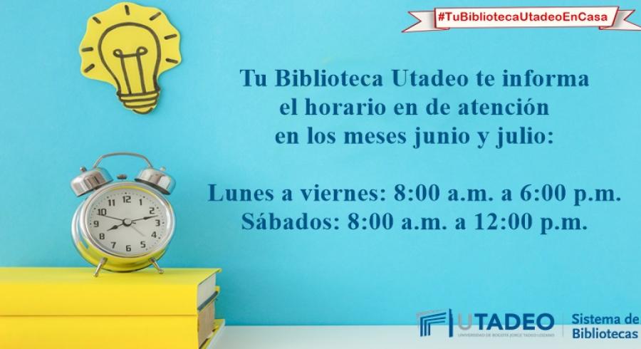 Tu Biblioteca Utadeo te informa el horario en de atención en los meses junio y julio.