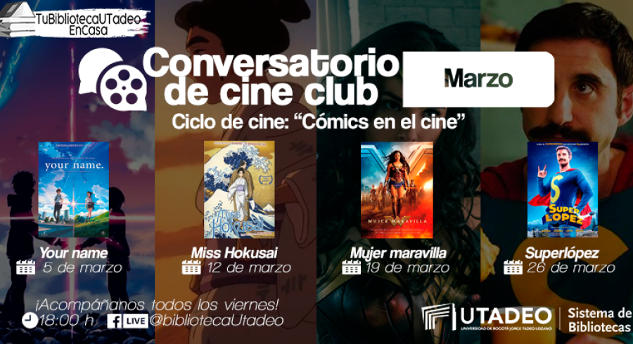 ![]() | Superlópez Fecha: Viernes, 26 de marzo Lugar: Clic aquí para ver el conversatorio Sinopsis: En esta adaptación de la tira cómica, Juan López debe hallar el equilibrio entre su trabajo de oficina y sus actos heroicos para salvar a su amor y al planeta Chitón. |