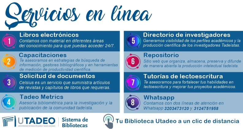 | @bibliotecaUtadeo | @bibliotecasUtadeo | 320 3473120 - 312 4751958 |