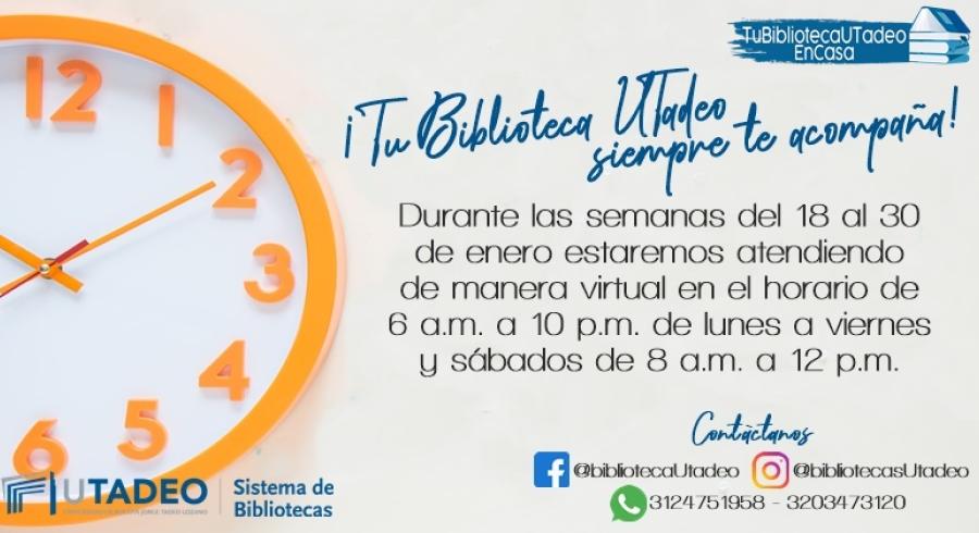 ¡Tu Biblioteca UTadeo siempre te acompaña! Durante las semanas del 18 al 30 de enero estaremos atendiendo de manera virtual en el horario de 6 a.m. a 10 p.m. de lunes a viernes y sábados de 8 a.m. a 12 p.m.