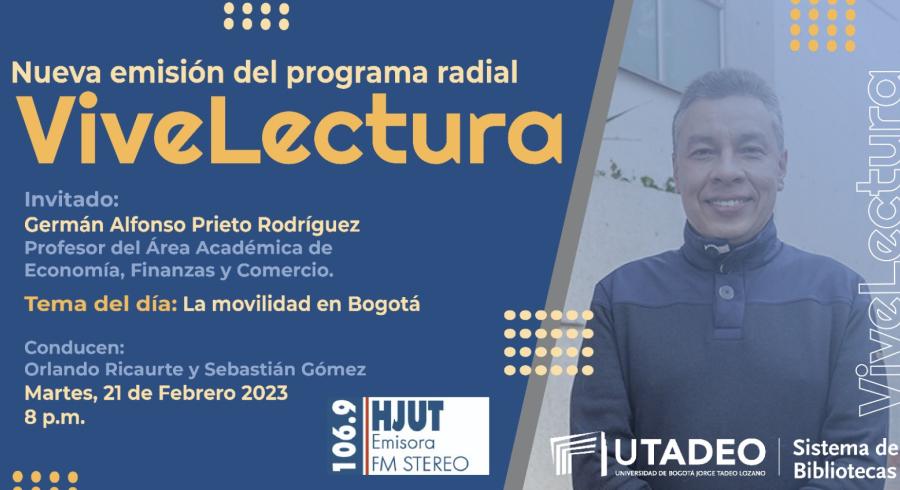 DestacadasViveLectura Compartir en Miércoles, Febrero 15, 2023Programa radial ViveLectura, Tema del día.¡Martes, 21 de febrero 2023 en ViveLectura!La movilidad en Bogotá, con el profesor Germán Alfonso Prieto Rodríguez.Por: Emisora HJUT 106. 9 FM ESTÉREO - 8:00 p.m.
