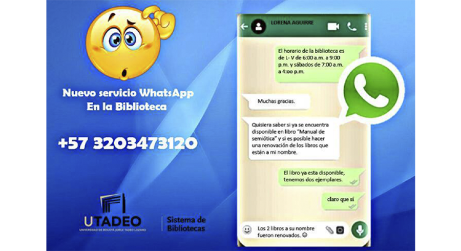 El sistema de bibliotecas Utadeo ofrece el nuevo servicio, WhatsApp como una herramienta más de comunicación en tiempo real, esto con el fin de resolver dudas o consultas relacionadas con los recursos, instalaciones, actividades, horarios, renovaciones o cualquier consulta referida a los servicios de la Biblioteca.