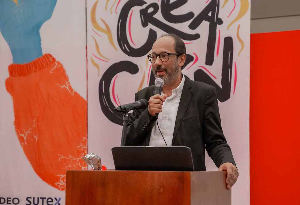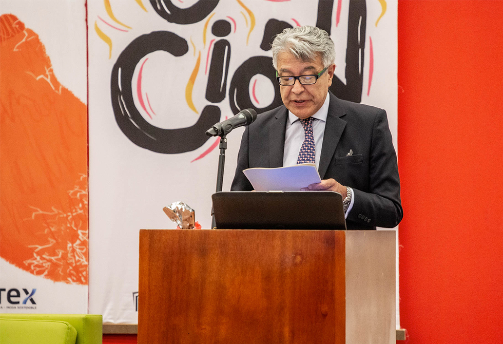Resaltando la creatividad, colores, luz y creaciones que rodeaban el Aula Múltiple del Edificio de Artes y Diseño, el Rector Carlos Sánchez Gaitán, se dirigió a los asistentes al evento haciendo un reconocimiento a la comunidad de profesionales que han aportado al desarrollo del país e hizo un recorrido por los hitos del diseño en el mundo.