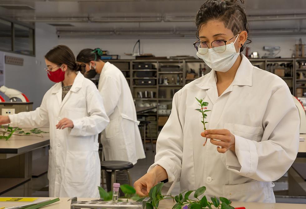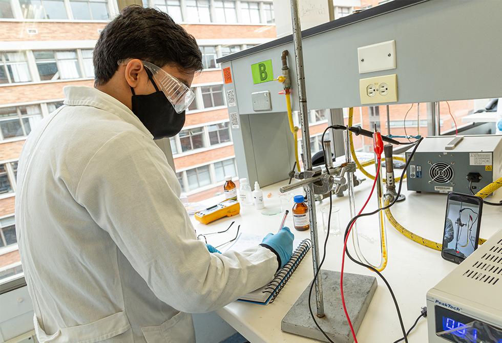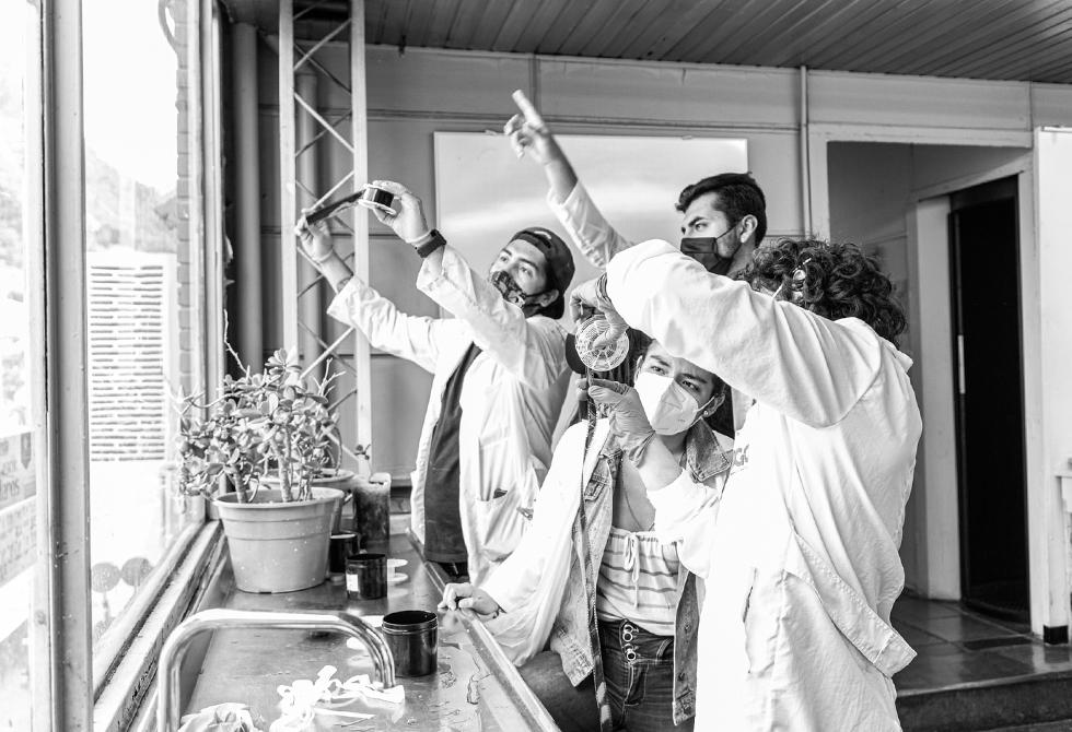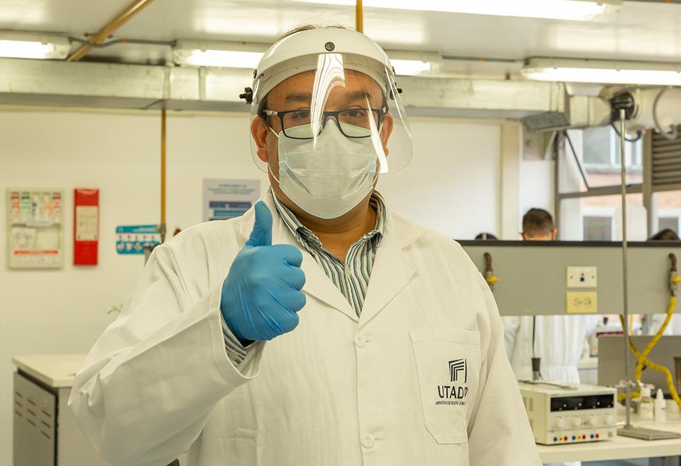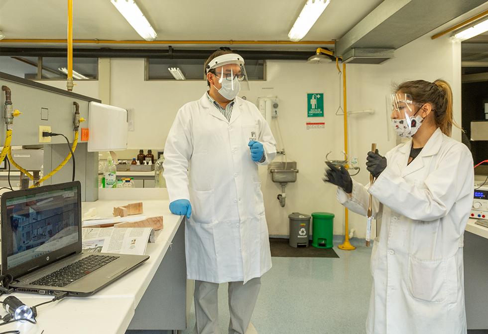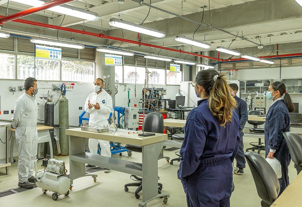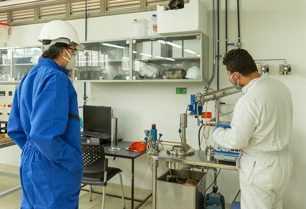 - En el laboratorio de Alta Presión y Reacciones Químicas, el profesor Franz Edwin López acompaña a sus estudiantesEl profesor Jonny Obando le explica a sus estudiantes las reacciones químicas que requieren flujo de corrienteTodas las áreas de los laboratorios están desinfectadas antes y después de cada uso. Los estudiantes deben mantener todos los elementos de bioseguridadSe realiza la medición de índice y frecuencia de estemas (estructura que indican el origen de las plantas)