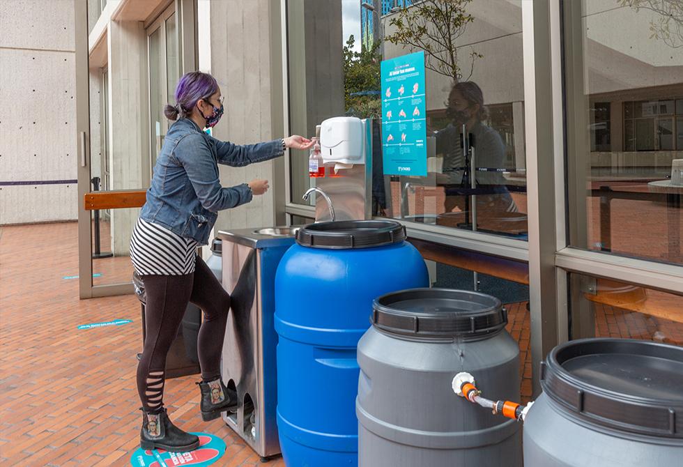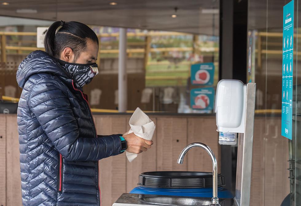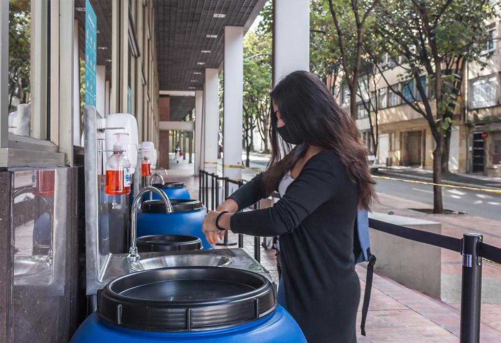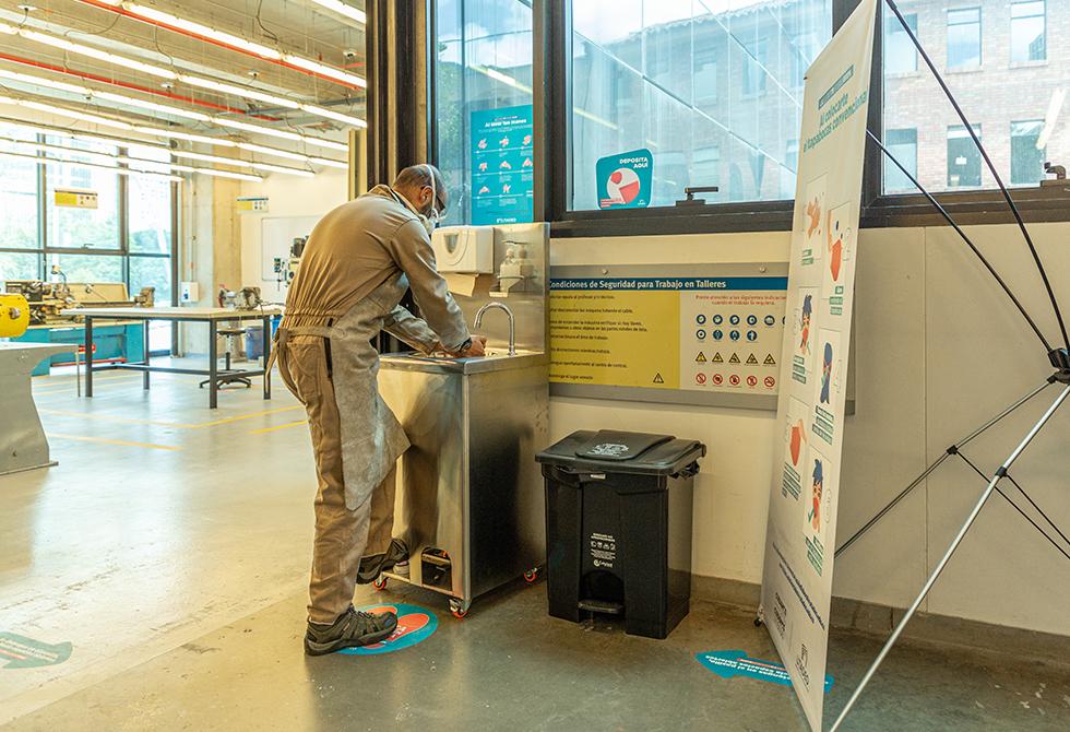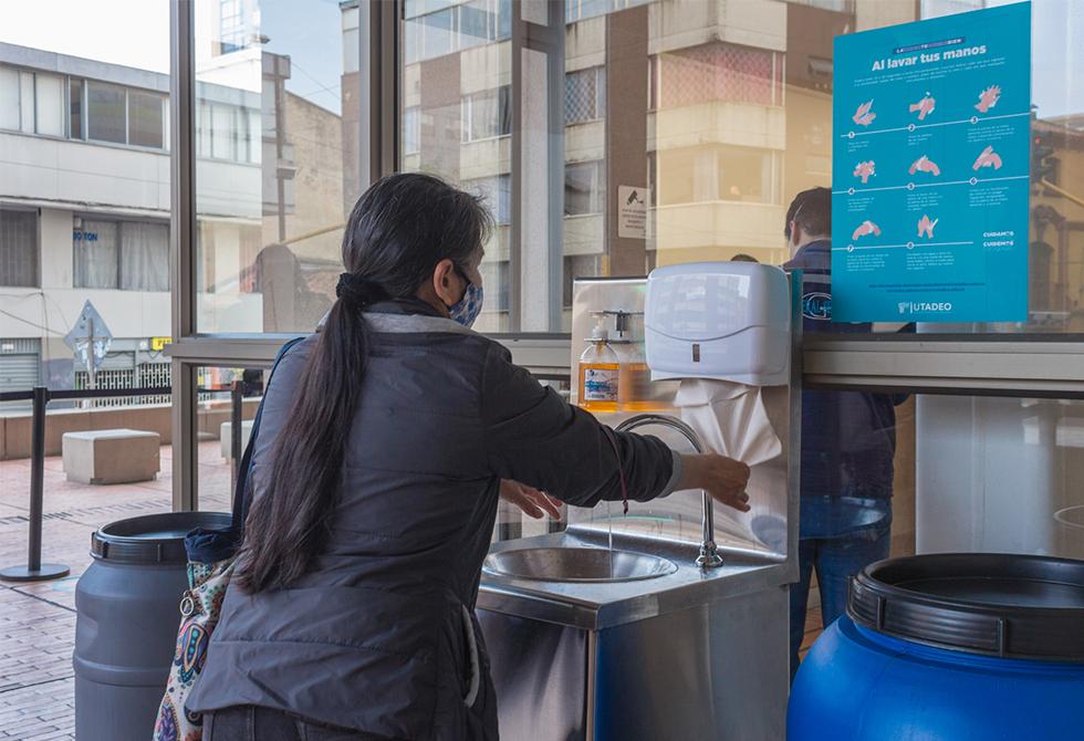 - Durante el ingreso y permanencia en las instalaciones de la Universidad es obligatorio el lavado de manos.Se hace una limpieza diaria y constante de todas las superficies de ingreso a la universidad, entre ellos los tapetes desinfectantesEn cada uno de nuestros edificios es importante que te registres antes del ingreso / Entrada del Edificio de Artes y Diseño