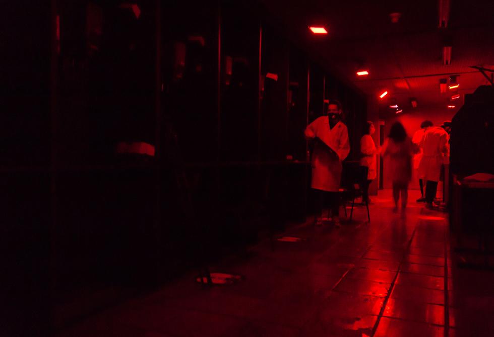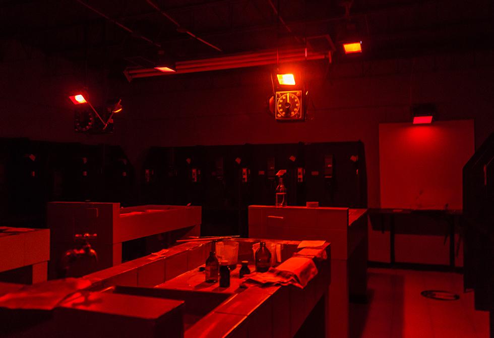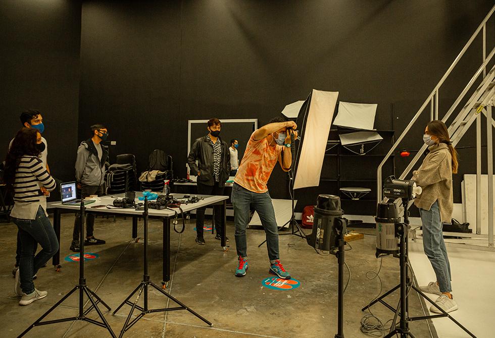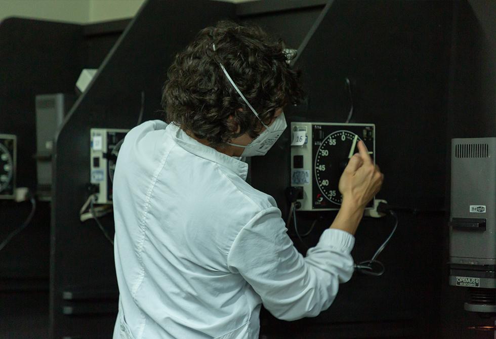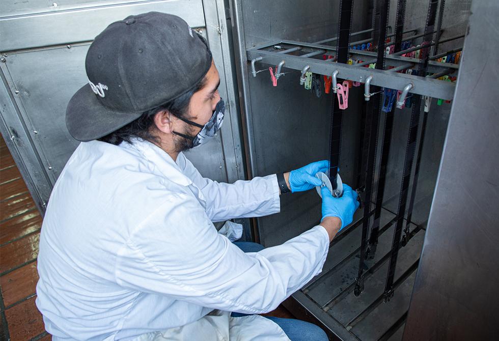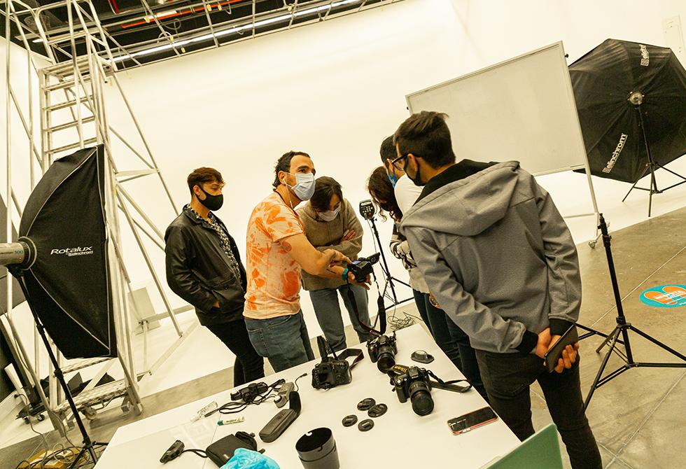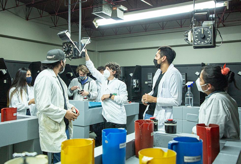 - Explicación del temporizador de la ampliadora fotográfica, la cual permite calcular el tiempo de exposición a la hora de hacer el positivado de la películaBajo la dirección y acompañamiento del profesor Diego Mauricio Granados, los estudiantes se preparan para su primera clase práctica en uno de nuestros laboratorios de fotografía, reforzando las medidas preventivas de distanciamientoCada estudiante se encarga de sacar la película del carrete de 35 mm y la cuelgan con precaución en las secadoras