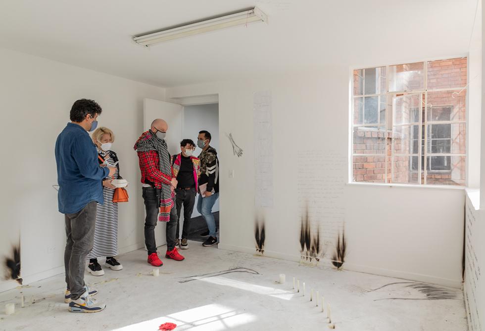 El profesor Felipe Arturo, cuenta que esta cohorte de la maestría se vio muy afectada por la pandemia, porque siendo un programa basado en el trabajo del taller artístico, no pudieron acceder al taller, tuvieron que desplazarlo a sus casas, a otros espacios, algunos tuvieron que viajar fuera de la ciudad, solo hasta el segundo semestre de 2021 pudieron volver a trabajar en los talleres el edificio MACA (siglas de la Maestría en Creación Artística), antiguo edificio Tollota, recuperando sus espacios naturales de trabajo y así terminar la maestría de manera presencial, algo que contribuye a la formación integral de los estudiantes, “por eso en el título dice -entre paréntesis- porque es llegar hasta aquí después de haber hecho un gran esfuerzo pasando por la pandemia y manteniendo el ritmo de trabajo, asistiendo a las reuniones de los profesores, de los profesores invitados, por eso para ellos fue un gran reto terminar la| maestría con estos procesos”.
