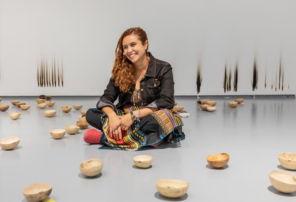 Cuenta que desde que ejerce la psicología lo hace a través del arte y todo tipo de expresiones que involucren la sensibilidad, articulando su proceso artístico con comunidades vulnerables, construyendo un espacio con velas, tierra y totumas como elementos principales para representar el dolor de todo un país, a partir de tradiciones del pacífico “Lo que yo quise hacer es una instalación que es un gran vientre representando nuestro país, el conflicto, todo lo que hemos vivido con otros tantos vientres que son de personas que se han levantado de la crisis, que han seguido, que han tomado las decisiones para seguir, por eso son totumas porque son como otros pequeños vientres y el ombligo que es el lugar en el cuerpo que te moviliza otra vez a andar a pesar de la crisis, de lo que hayas vivido, es como si te jalaran para otra vez andar es una marca que nos une con la mamá, los hijos pero también con otros, con sueños, es como un hilito que nos impulsa”.