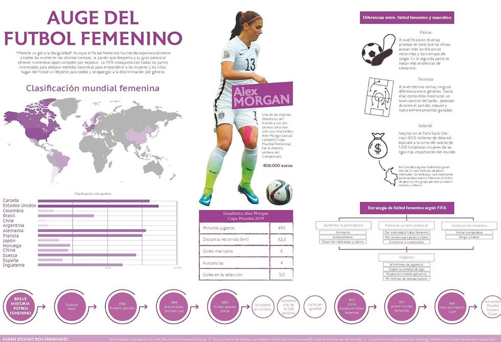 Inspirados en la infografía como herramienta informativa para desarrollar un tema con gráficos, los alumnos del Estudio de Diseño e Información se valieron de su creatividad para transmitir los datos más relevantes de, por ejemplo, el “Auge del fútbol femenino”, realizado por Karen Roa, y “Esto no se trata de villanos” de Luis Aguiar, en el que expone con ilustraciones algunos de los motivos por los cuales buena parte de la población rural se sumó a las filas de la guerrilla.