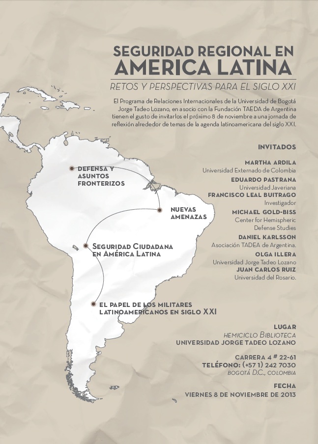 El Programa de Relaciones Internacionales de la Universidad de Bogotá Jorge Tadeo Lozano, en asocio con el apoyo de la Fundación TAEDA de Argentina realizarán en Bogotá el próximo viernes 8 de noviembre en el Hemiciclo de la biblioteca una jornada de reflexión cuyo nombre será: SEGURIDAD REGIONAL EN AMÉRICA LATINA: RETOS Y PERSPECTIVAS PARA EL SIGLO XXI.
