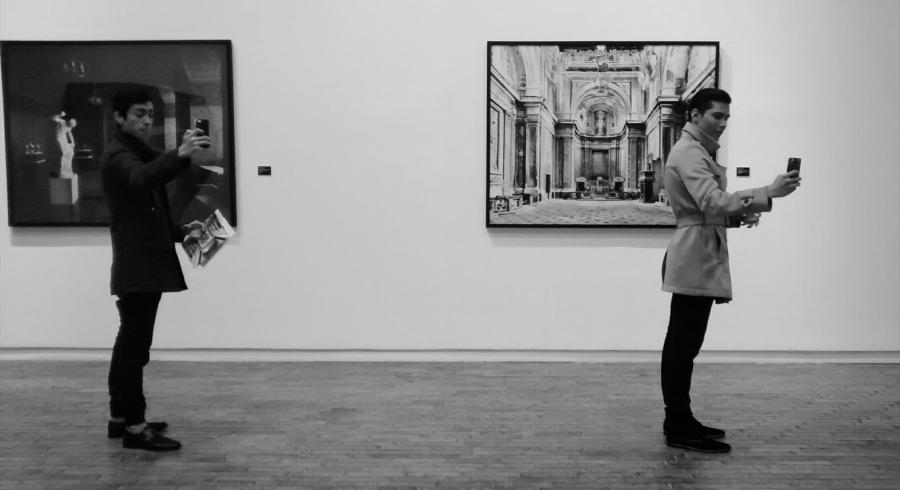 Pero lo que más me llamo la atención ese día fue ver, mientras tomaba un descanso sentada en una banca a mis dos amigos tomándose selfies con sus celulares en cada obra de arte, cambiando el gesto, buscando los mejores ángulos que permitieran registrar tanto la obra como a ellos mismos, alargando o frunciendo los labios, o levantando una ceja; así que saque mí propio celular y registré el instante que me permitió reflexionar acerca de las dinámicas culturales y los comportamientos que llevamos a cabo en la cotidianidad. Me hizo ver como a través del seflie vivimos las experiencias y las compartimos con las demás personas a través de nuestros dispositivos móviles quedando en la memoria del dispositivo. Sin embargo, es también una dinámica fugaz y algo superficial; una imagen muere a cada segundo en cada red social y eso nos debe hacer cuestionar la forma en que experimentamos el ahora, si es a través de la fotografía o si en verdad lo experimentamos a través de nuestros sentidos".