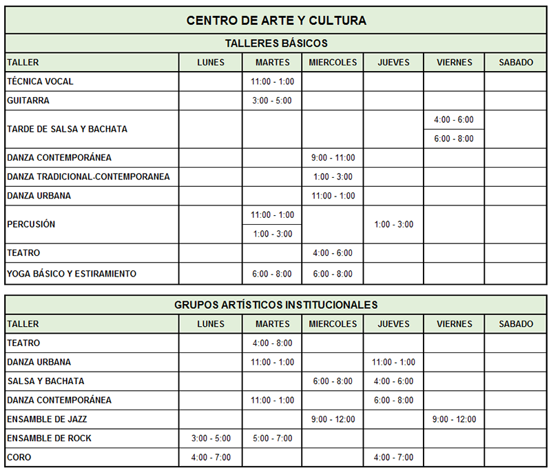 La semana del lunes 6 de febrero inician los talleres en las diferentes áreas artísticas y de desarrollo humano donde encontrarás, danzas, teatro, yoga, coro, ensamble de rock y Jazz entre otros, que estarán abiertos durante el primer periodo académico de 2023, es una magnífica oportunidad de aprovechar el tiempo libre entre clases, descubrir y potencializar tus talentos mientras conoces nuevos amigos.