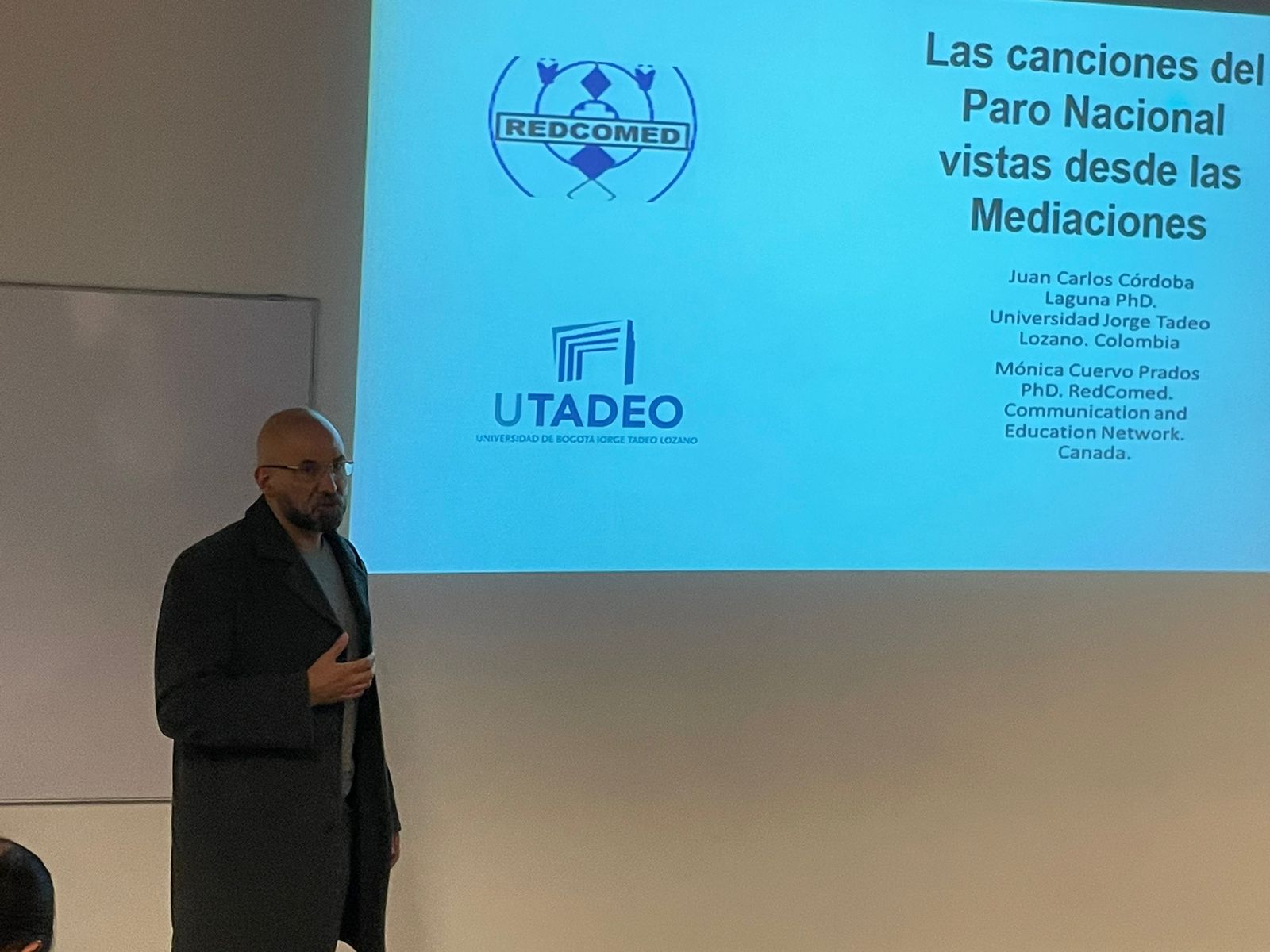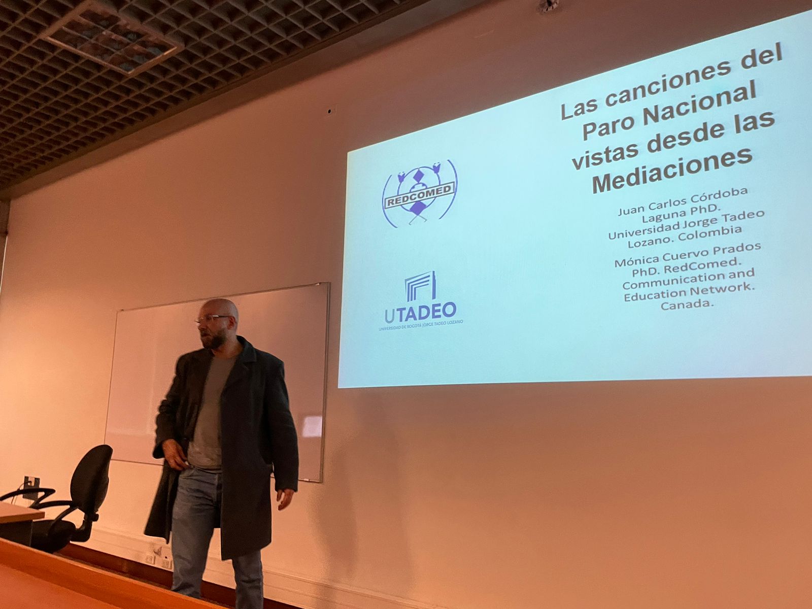Juan Carlos Córdoba, profesor del programa de Comunicación Social y Periodismo, presentó el pasado 2 de junio de 2023, en el IX Seminario de Investigación + Creación Tadeísta, su ponencia acerca de la descripción de los contenidos de las canciones del Paro Nacional de 2019 y de 2021, a la luz de las mediaciones; un proyecto aprobado en la convocatoria interna de la Universidad Jorge Tadeo Lozano que se desarrolla en conjunto con la Red Comed, (Red de Comunicación y educación) con sede en Canadá.