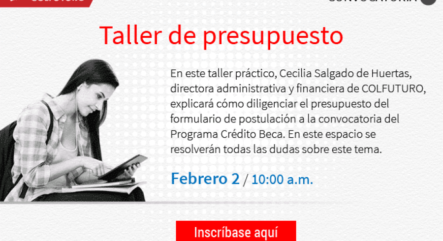 Para este taller práctico, Cecilia Salgado de Huertas, Directora Administrativa y Financiera de COLFUTURO, explicará cómo diligenciar el presupuesto del formulario de postulación a la convocatoria del Programa Crédito Beca. Este espacio permitirá resolver las dudas acerca del tema.