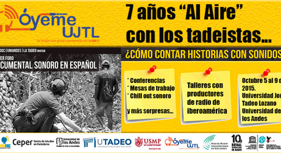 En el marco de la celebración de los 7 años de funcionamiento de la Emisora Óyeme UJTL, la Universidad de Bogotá Jorge Tadeo Lozano en asocio con la Universidad de los Andes y el apoyo del Centro de Estudios en Periodismo –CEPER–, la Universidad San Martín de Porres, la Red de Radio Universitaria de Colombia, la Bienal de radio y la Unesco, organizan el I Foro de Documental Sonoro en Español, SONODOC.
