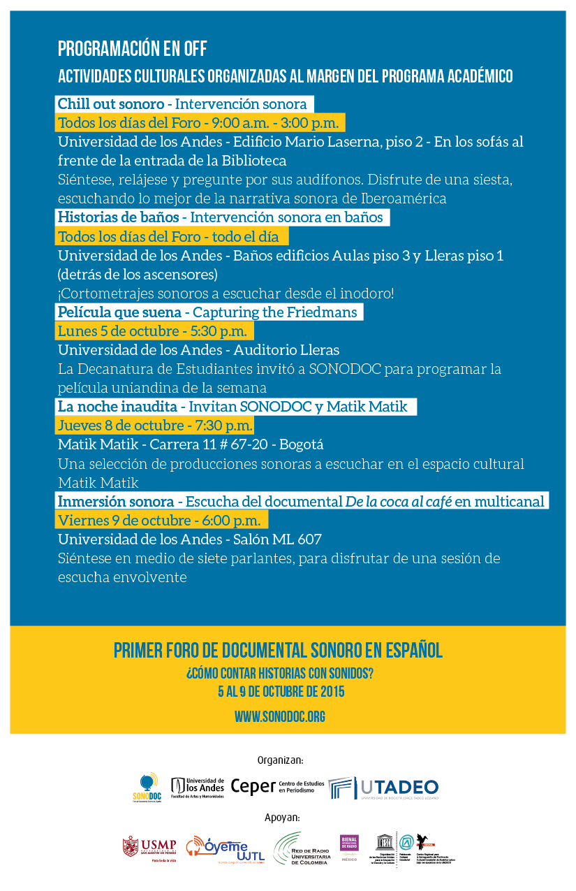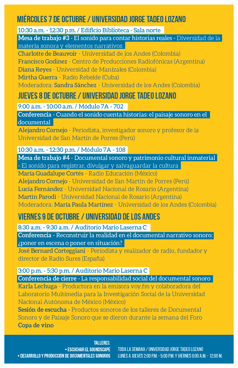 NovedadesProgramación del I Foro de Documental Sonoro Compartir en Viernes, Octubre 2, 2015Del 5 al 9 de octubre en la Tadeo y los Andes mediaprograma-01.png mediaprograma-02.png mediaprograma-03.png mediaprograma-04.png