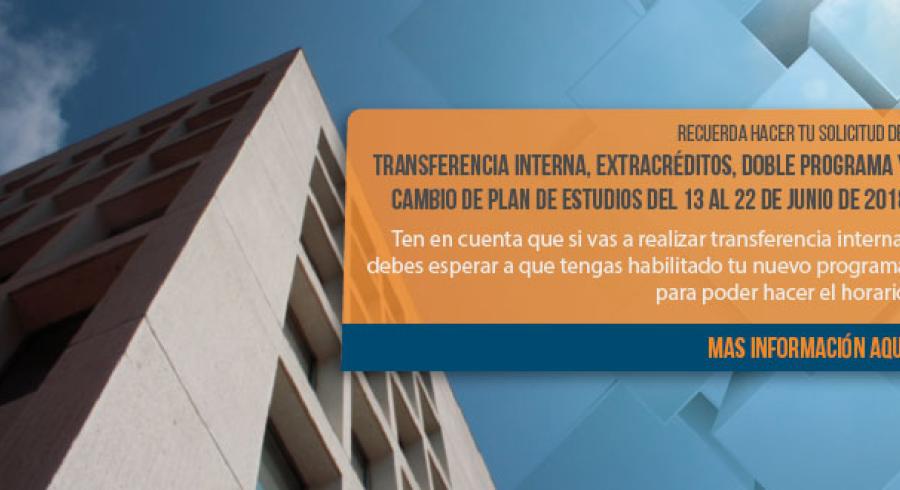 Tenga en cuenta que si usted está interesado en realizar trámites como Transferencia Interna, Doble Programa, Extracréditos o Cambio de Plan de Estudios, la plataforma estará habilitada para que haga la solicitud a partir del 13 y hasta el 22 de junio de 2018.