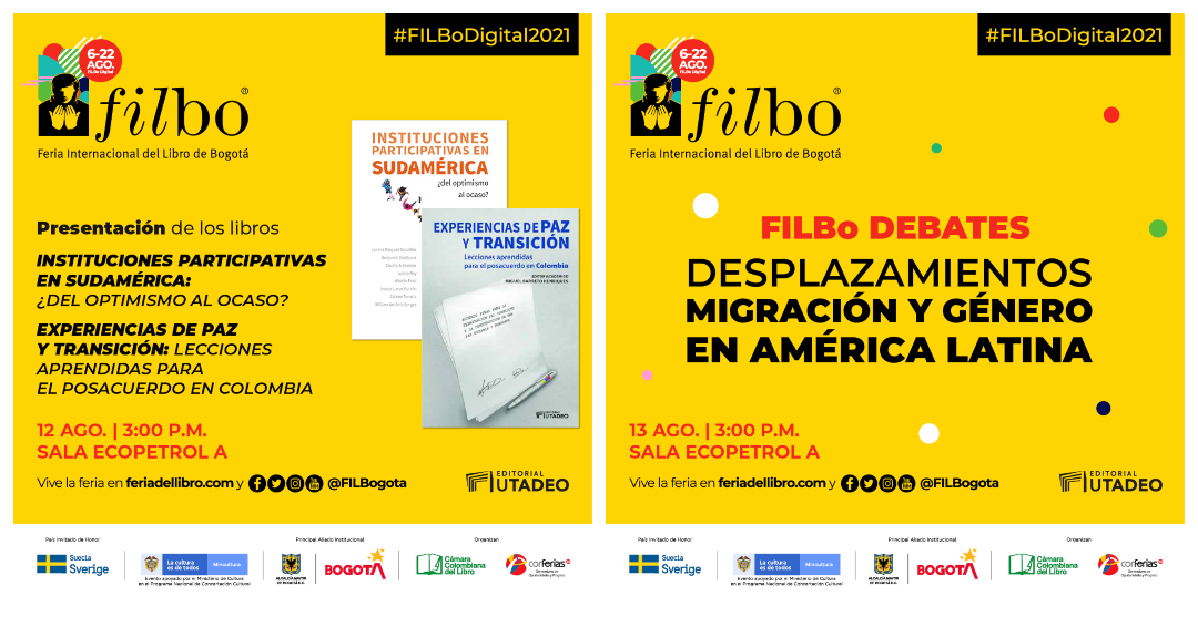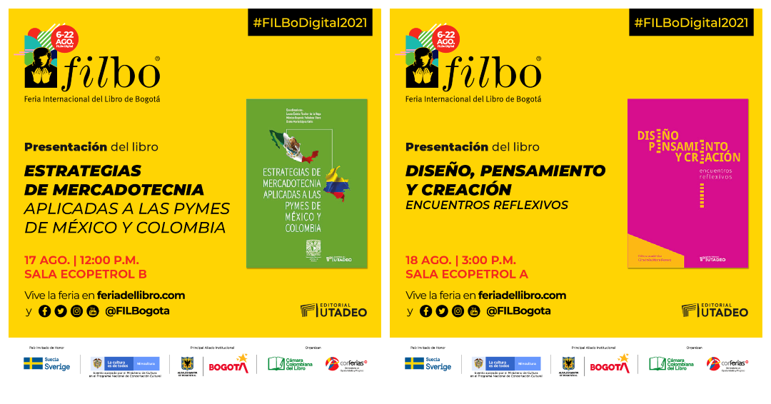 Los invitamos a conocer más de nuestra agenda en la Filbo 2021 y del catálogo de Editorial Utadeo en Facebook: @EditorialUtadeo Twitter: @EditorialUTadeo, Instagram: @editorialutadeo