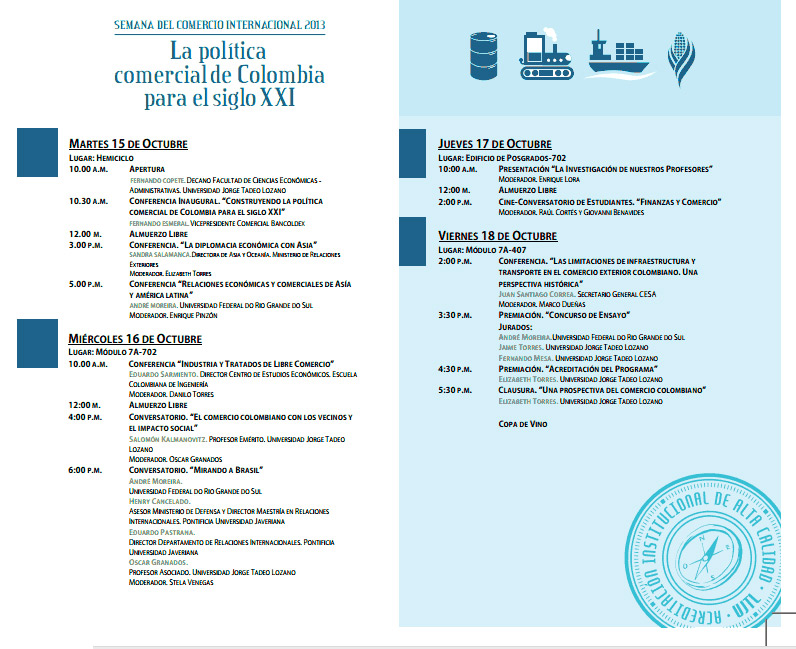 Para analizar la Política Comercial de Colombia para el Siglo XXI, la Universidad Jorge Tadeo Lozano realizará del 15 al 18 de octubre la Semana del Comercio Internacional 2013.