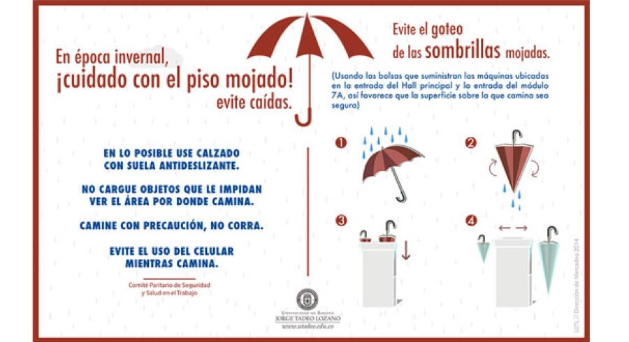 • En los días de lluvia, una vez use su sombrilla, empáquela en las bolsas que suministran las  máquinas  ubicadas en la entrada del Hall principal y el módulo 7A , haga uso racional de este servicio, y tenga en cuenta que las bolsas pueden ser reutilizadas. ¡Evite mojar el piso!.