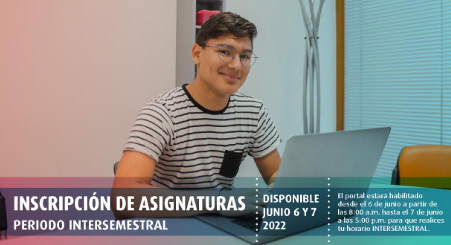 Si estás interesado en cursar asignaturas durante el periodo INTERSEMESTRAL, ten en cuenta que el portal estará habilitado desde el día lunes 6 de junio a partir de las 8:00 a.m. hasta el martes 7 de junio a las 5:00 p.m.