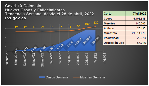 De acuerdo con las cifras del Instituto Nacional de Salud, facilitadas el pasado 7 de julio, durante la primera semana del mes de julio, se presentó una leve disminución semanal en la incidencia (-0,67%), se detectaron 23.667 nuevos casos, llegando a 6.198.848 casos, permanecen activos 25.057 pacientes, fallecieron en la semana 132 personas, lo que implica un incremento del 32% con respecto a la semana inmediatamente anterior y llegando a un agregado de 140.202 fallecimientos; el gráfico adjunto presenta la evolución semanal de incidencia y letalidad desde el 28 de abril, donde se aprecia un alza continuada de ambos indicadores, mientras que durante la primer semana de mayo se presentaron 12 fallecimientos, para el 7 de julio, tal y como se indicó anteriormente se confirmaron 132 eventos por semana; se tuvo una incidencia de 978 casos para la semana del 5 de mayo, para la semana corte del 7 de julio fueron confirmados 23.667 casos, esto acompañado de una positividad del 22,67% en un agregado de 21 millones de pruebas.