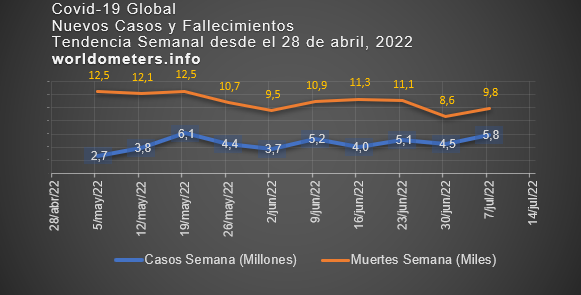 Los expertos siguen con atención a las subvariantes de Ómicron BA.4 y BA.5, responsables de una nueva ola de infecciones a nivel mundial, con una tasa de crecimiento del 12% entre los meses de mayo y junio (Cerca de 17 millones de casos en mayo y 19 millones de casos en junio), según lo manifestó la Organización Mundial de la Salud -OMS- el pasado 7 de julio; agregó además, que la tasa de muerte está a la baja, -13% entre mayo y junio (Aproximadamente 48 mil eventos en mayo y 42 mil eventos para junio), la tendencia semanal de incidencia y letalidad presentada en el siguiente gráfico, permite ver una disminución de las muertes desde la primera semana del mes de mayo cuando se tuvieron 12,5 mil fallecimientos, mientras que durante la primera semana de julio se presentaron 9,8 mil eventos fatales; en contraste, la incidencia viene en alza desde la primera semana de mayo donde se confirmaron 2,7 millones de casos y para la primera semana de julio se presentó una confirmación de 5,8 millones.