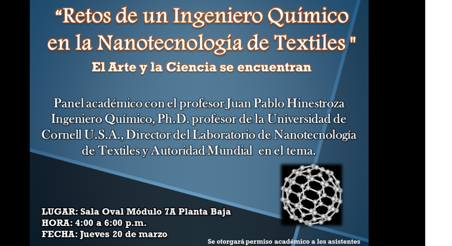 Participe el próximo 20 de marzo a las 4:00pm en el Hemiciclo, del debate con el Ingeniero Químico Juan Pablo Hinestroza lider de talla mundia en el tema de Nanotecnología en el sector textil. En la mesa de debate se encontrarán otros expertos nacionales de esta nueva tecnología que revoluciona el mundo. Los estudiantes que asistan contarán con permiso académico.