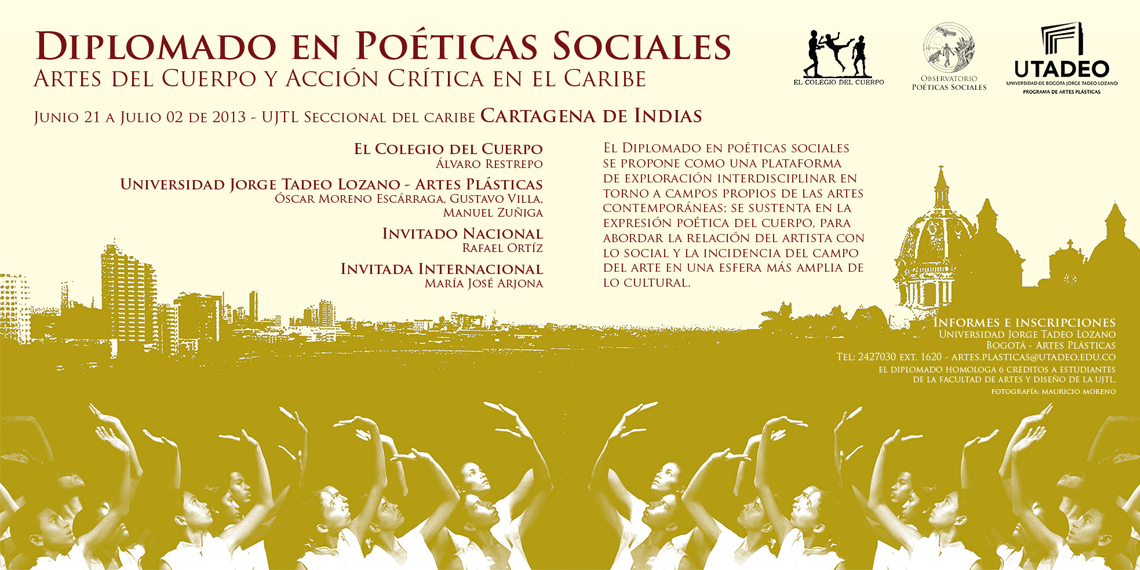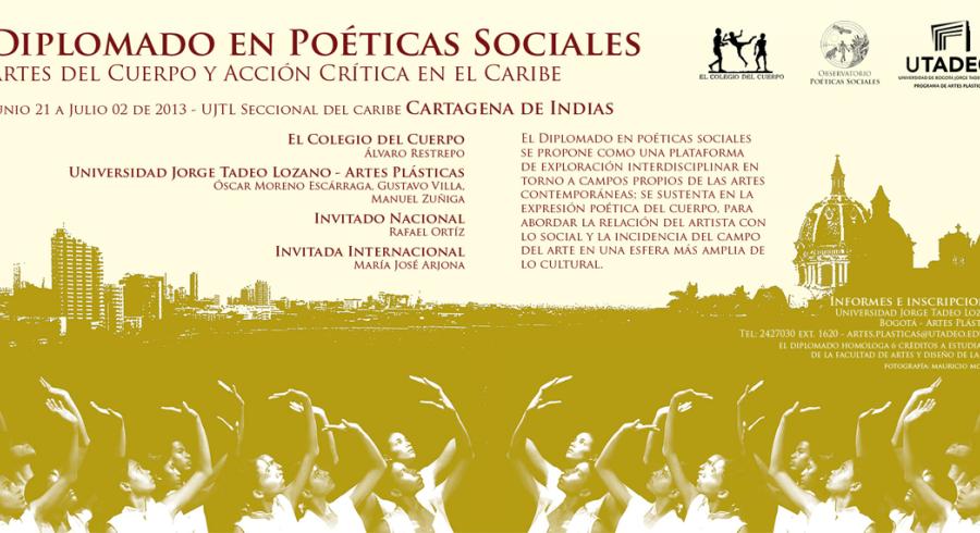 El Diplomado en Poéticas Sociales se planteó como una plataforma de exploración interdisciplinaria en torno a campos propios de las artes contemporáneas; se sustentó en la expresión poética del cuerpo, para abordar la relación de los artistas con lo social y la incidencia del campo del arte en una esfera más amplia de lo cultural.